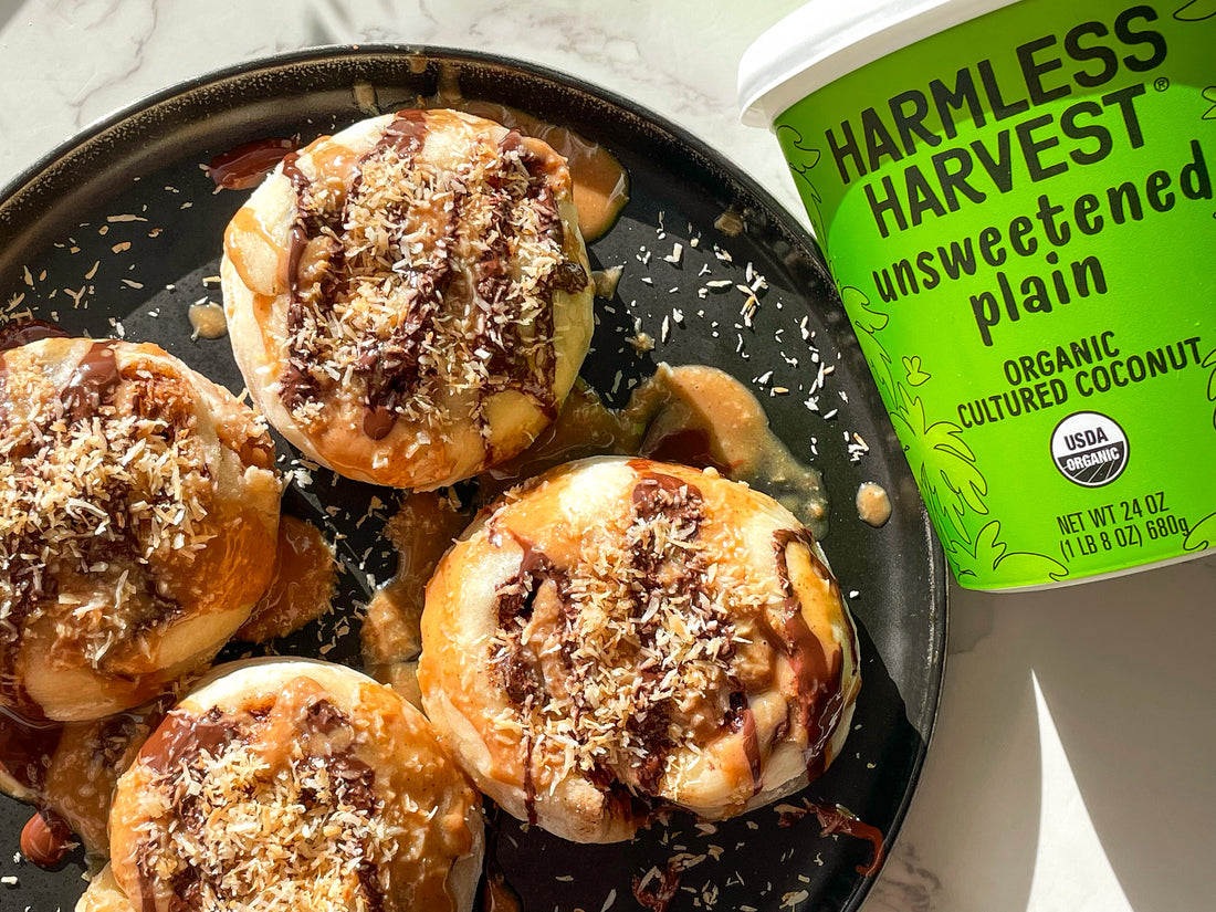 Like all the best seasons, Girl Scout Cookie season is painfully short. When that chewy, caramelly, cookie-with-coconut craving hits it can be tough to get your fix. Even if you can’t track down some Girl Scouts, we’ve got you covered with this sweet and easy breakfast recipe. Unlike other cinnamon rolls, this recipe doesn’t rely on yeast, so it comes together quickly with some seriously delicious ingredients. The star of the show dough is our Harmless Harvest Plain Dairy-Free Yogurt Alternative. Our unsweetened coconut yogurt makes for a tender dough ready in just minutes. Mix your filling and roll it up! You’re practically done.