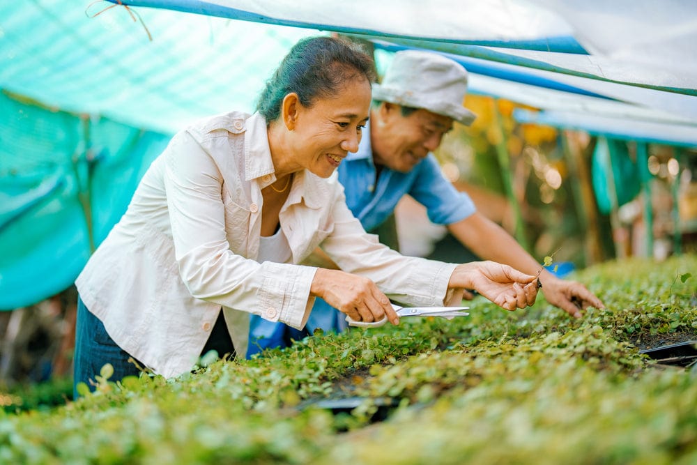 These farmers have created a large cover crop nursery of round leaf seedlings for their farm and neighboring farms. Cover crops are a critical regenerative organic practice because they protect soil from erosion and keep nutrients in the ground.
