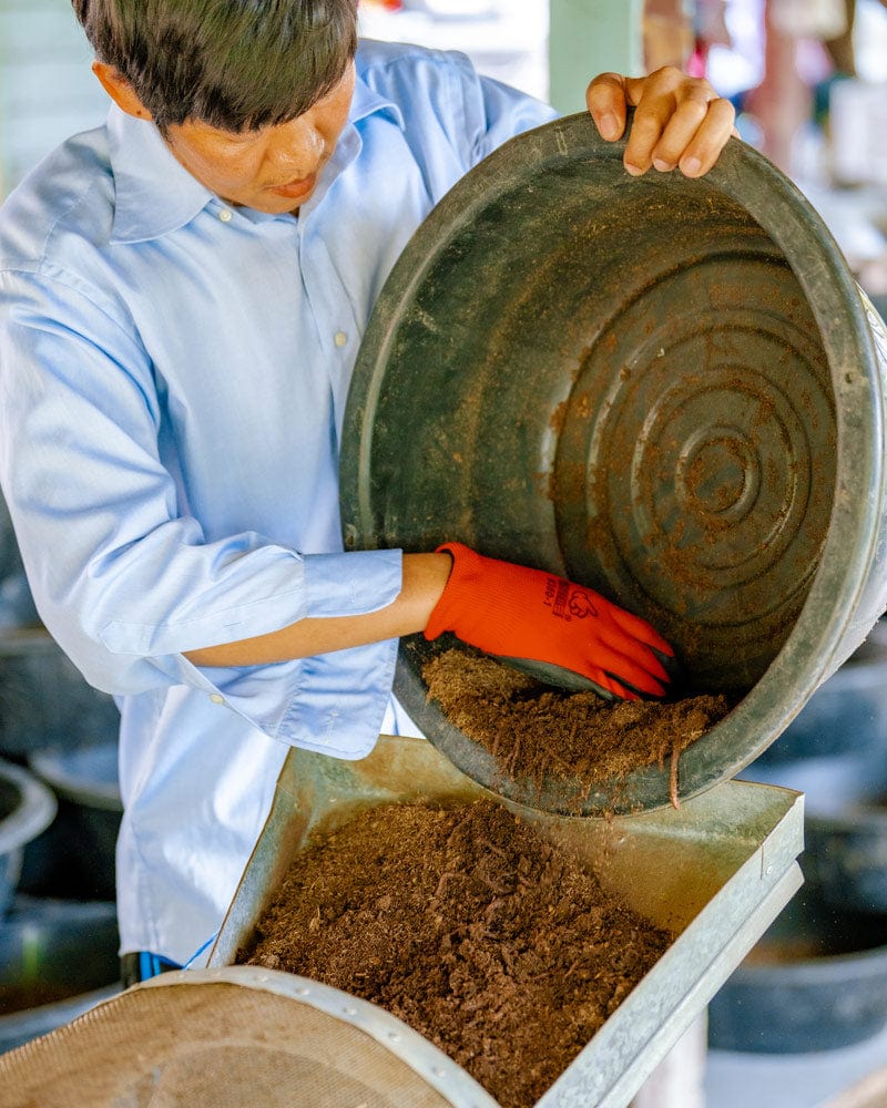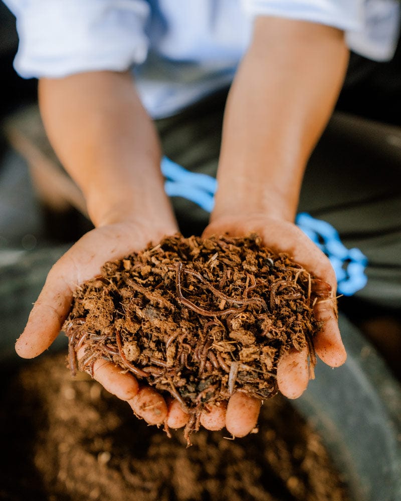 Vermicompost, or… raising earthworms to create vermicompost, a natural nutrient-rich fertilizer. This helps provide nutrients to the soil, which can result in healthier farms and (ultimately) increased coconut yields!