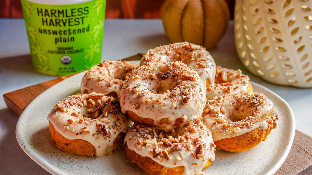 These delicious pecan sweet potato donuts with a coconut maple glaze has all of your favorite fall flavors packed into one sweet bite, plus a coconutty twist thanks to Harmless Harvest dairy-free coconut yogurt.